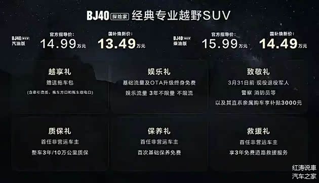 结语:北京越野BJ40探险家的外观沿用上代车型的造型,内饰则换成了全新一代车型的设计,配备15.6英寸中控屏和高通骁龙8155芯片,提供2.0T汽油和2.0T柴油可选,你会考虑它吗。