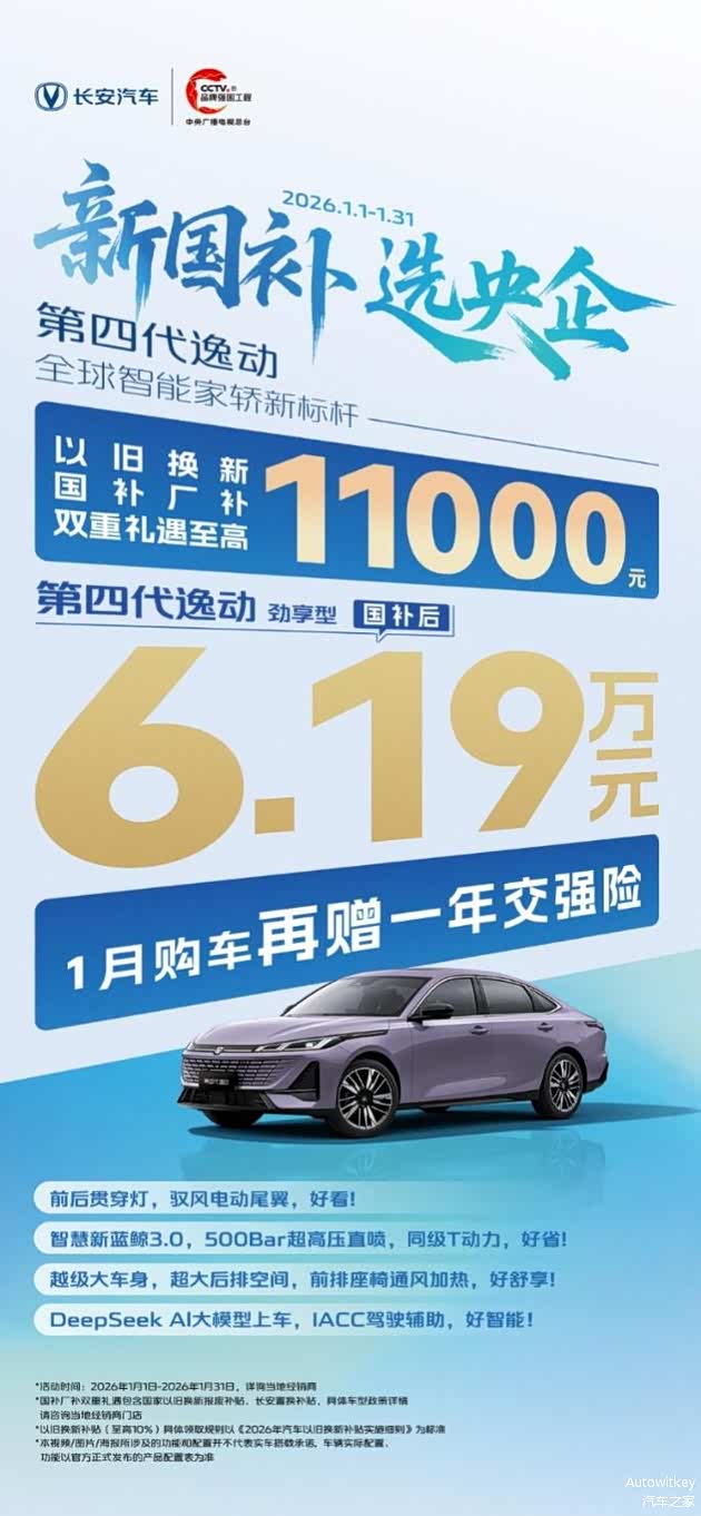 当下,正值长安汽车“新国补 选央企”活动推进,即日起-2026年1月31日,第四代逸动更推出以旧换新国补厂补双重礼遇至高11000元,劲享型国补后仅6.19万元,1月购车再赠一年交强险,进一步强化其“冠军价值”。这样一款有口皆碑的“全球智能家轿新标杆”,配合如此力度的政策,性价比不言而喻。