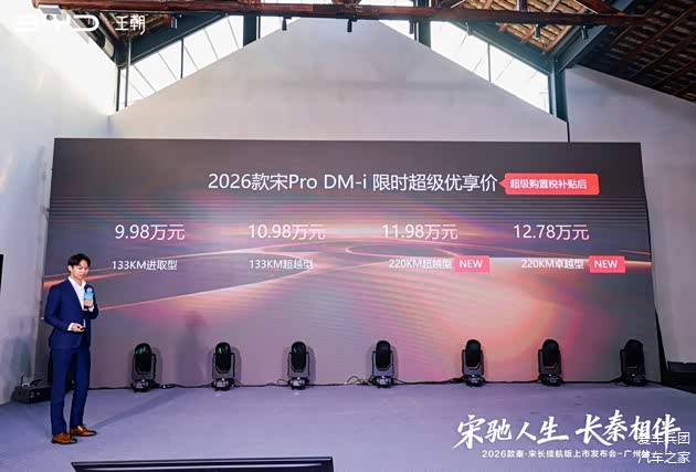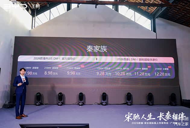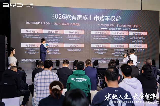 宋驰人生·长秦相伴,比亚迪王朝网相继推出了2026款 秦PLUS DM-i、秦L DM-i及宋Pro DM-i三款长续航版本车型,此次在广州大区再次公布优享价以及相关权益。