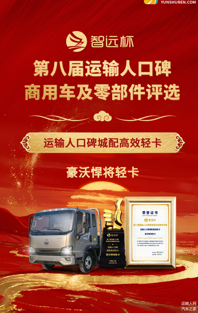 2026年1月16日,运输人网主办的第八届“智远杯”运输人口碑商用车及零部件评选线上颁奖活动隆重举行,中国重汽豪沃悍将轻卡荣获“运输人口碑城配高效轻卡”奖项。