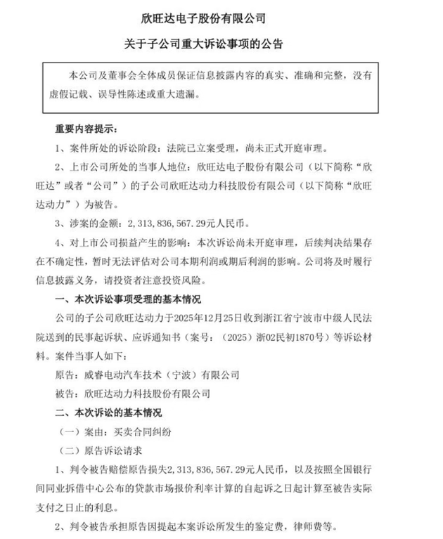 2026年新能源汽车行业的开年,没等来新品扎堆的热闹,反倒被一场电池纠纷搅得满城风雨。吉利旗下威睿电动直接把供应商欣旺达告上了法庭,一开口就是23.14亿元的索赔——这笔钱差不多能覆盖欣旺达近两年的净利润总和,这般强硬态度,连业内老人都觉得少见。与此同时,沃尔沃EX30在全球启动紧急召回,几十万车主被通知充电上限只能设到70%,本就受冬季续航短板困扰的大家,无疑是雪上加霜。
