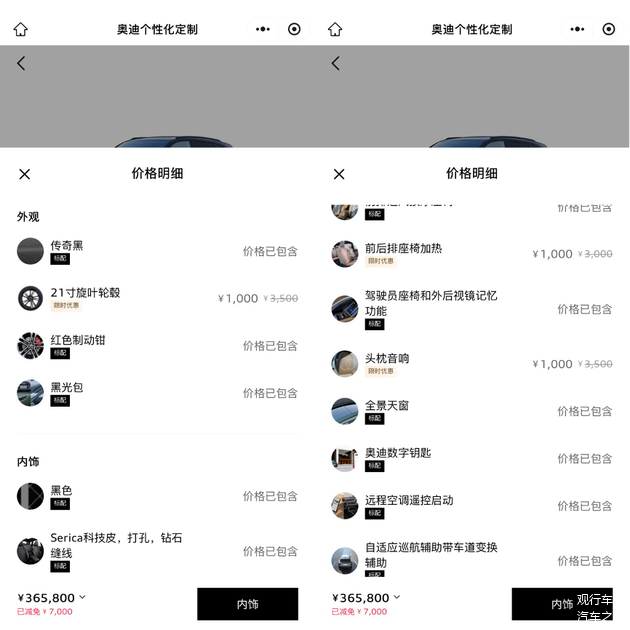 如果感兴趣的读者,可以在一汽-奥迪的官方小程序上面自己的选配一下,绑定逻辑比较复杂一点。
