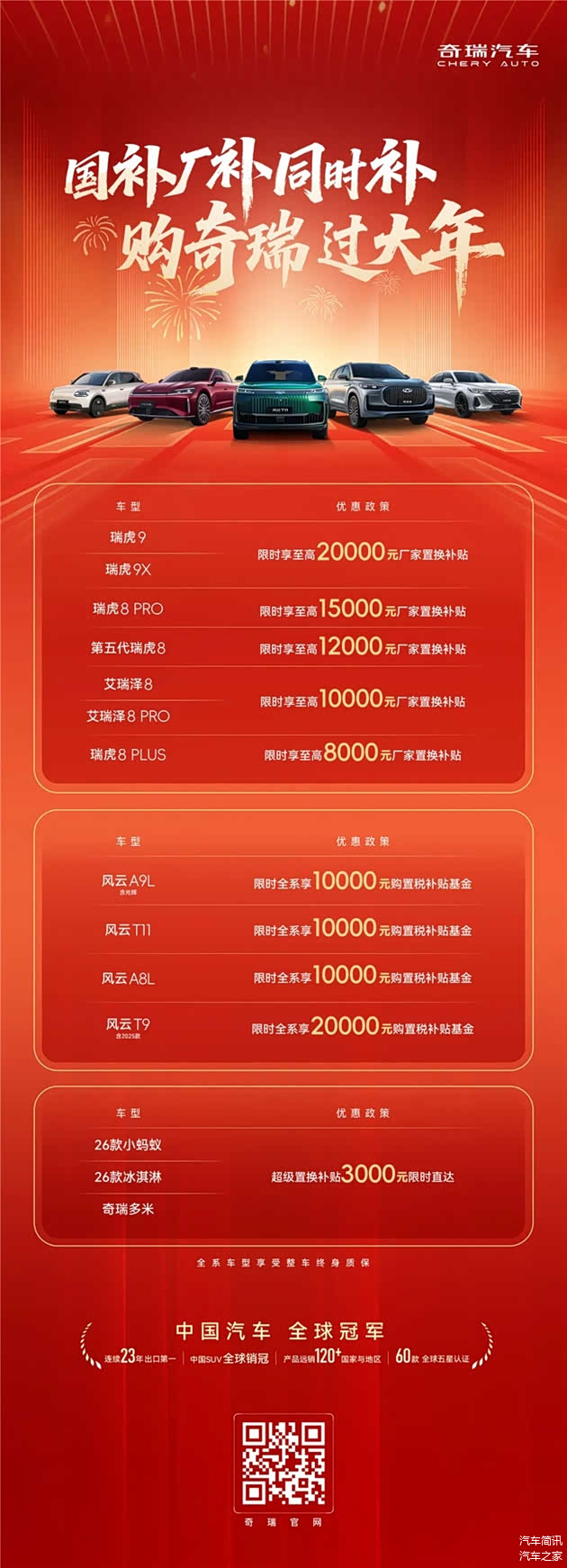 在国家大力推动汽车消费升级的背景下,奇瑞汽车主动扛起责任,将企业发展与民生需求深度绑定,以“国补+厂补”双轮驱动模式,构建覆盖燃油、新能源全品类的补贴矩阵,实现了政策红利与企业让利的精准触达。