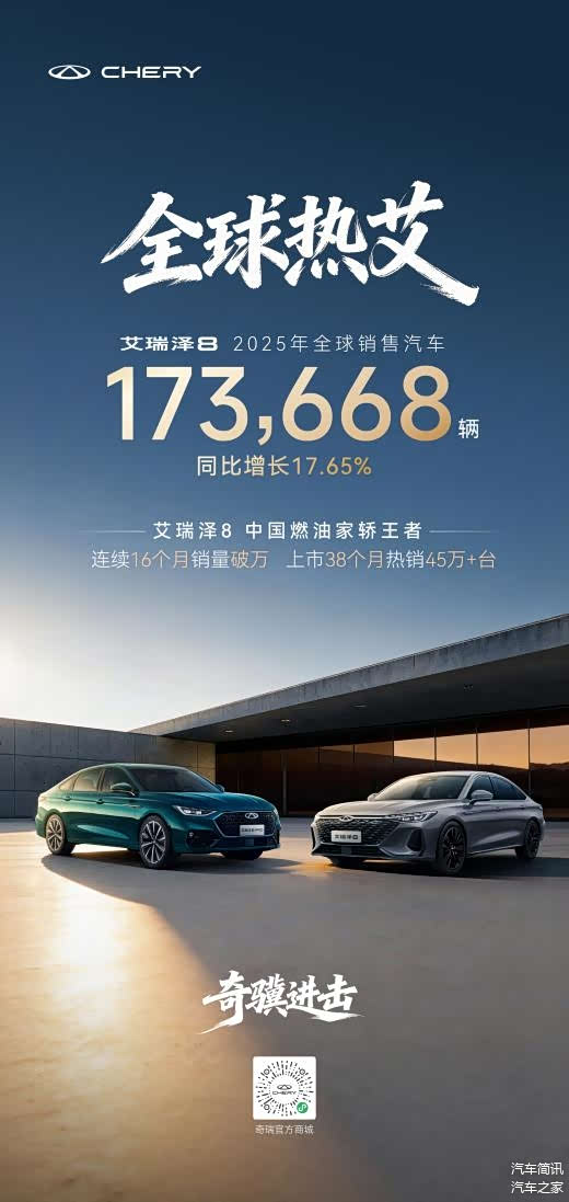 2025年,艾瑞泽8家族以全球销量173668辆、同比劲增17.65%的硬核战绩圆满收官;自上市以来,家族38个月累计销量突破45万辆,更创下连续16个月销量破万的行业佳绩,在竞争激烈的市场红海稳立潮头。艾瑞泽8家族的成功并非偶然,在同质化竞争激烈的家轿市场,家族通过艾瑞泽8与艾瑞泽8 PRO双线布局,全面覆盖家庭实用、运动性能等多元化需求,持续吸引年轻消费群体。这种快速响应市场的进化能力与精准的市场布局,正是其赢得全球用户青睐的关键所在。