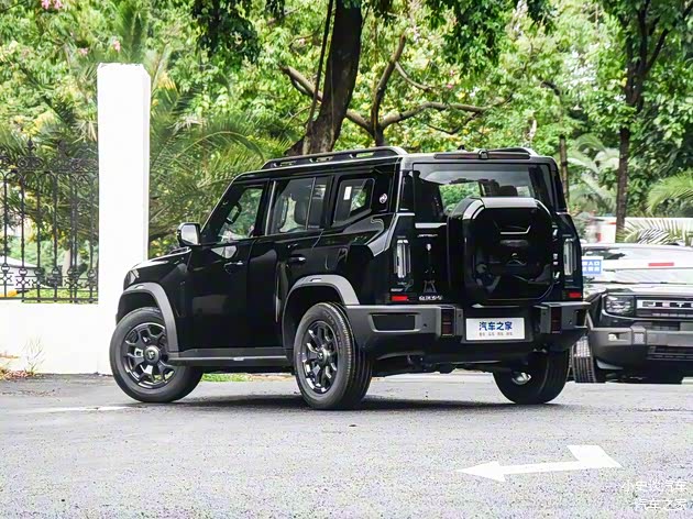 再来看车身侧面部分,车身侧面延续了方盒子硬派造型,平直车顶搭配黑色行李架,宽体黑色轮眉与哑光黑轮辋呼应,固定式上车踏板兼顾实用与美观。车身尺寸为4795mm/2006mm/1870mm(带备胎版本1880毫米)毫米,轴距2800毫米,宽敞的尺寸保障了驾乘空间。黑色外后视镜壳和车窗饰条进一步强化了黑化风格,使整车在阳光下呈现出低调而炫酷的视觉效果。这种设计不仅提升了通过性,还通过优化风阻系数降低了高速行驶时的风噪。