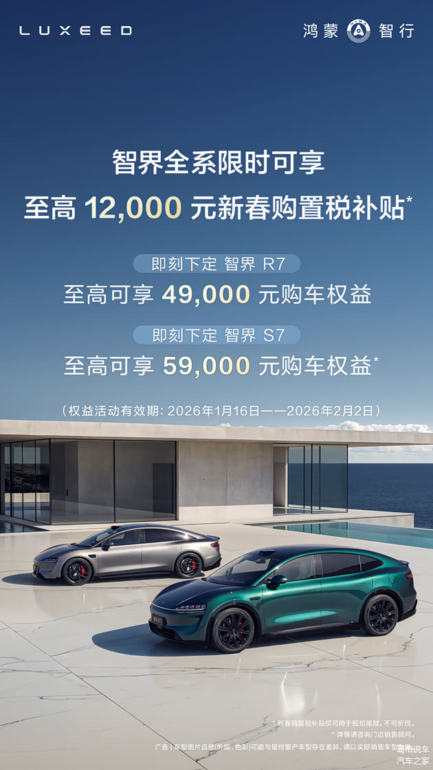 而且还能叠加车型权益,智界R7至高能再享49000元,智界新S7更是给到了59000元的上限,整体优惠算下来很可观。智界敢这么放福利,也是有底气的,连续三个月交付都破万,品质和口碑都是市场验出来的。想赶在年前提车撑场面、方便走亲戚的,这波窗口期可以抓住,既享了优惠,又买得踏实。#智界R7##智界新S7#