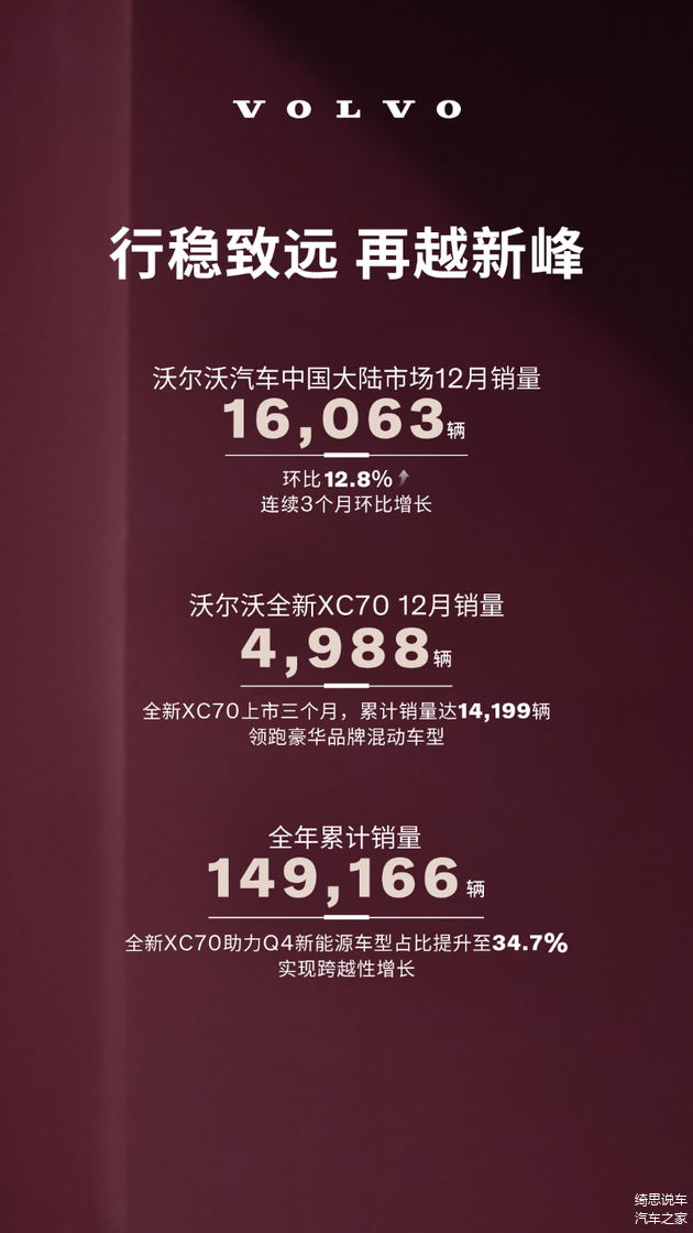 当不少品牌还在为年末销量波动反复调整节奏时,沃尔沃用一组数据,为2025年画下完美句号:12月中国大陆市场销量16,063辆,环比增长12.8%;全年累计销量149,166辆。放在当下豪华车市场的整体环境中,这样的沃尔沃销量并不追求情绪高点,而更像是一次稳扎稳打后的自然结果。