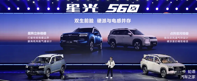 作为宏光侠概念车的量产版本,星光560外观保留了硬朗风格。燃油与混动版采用矩形网状格栅,纯电版则为封闭式格栅。全系标配双横线式LED大灯,车身提供星际蓝等四种颜色。侧面采用悬浮式车顶与亮黑色行李架,长宽高分别为4745/1850/1755(1770)mm,标配18英寸轮圈。车尾设计简约统一。