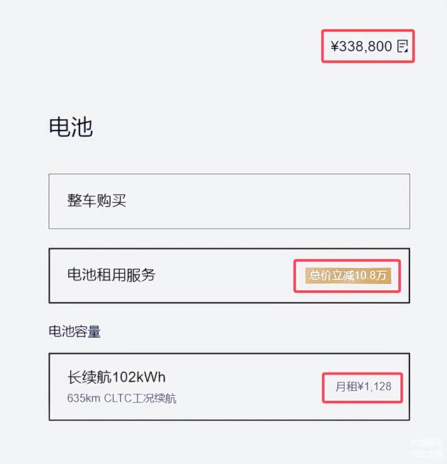而这时候,租电的好处就凸显出来了,首当其冲的,就是车价了,直接降低10.8万,你只需要出33.88万,每个月电池的租金也不过才1128元,哪怕叠加上商业险,一个月顶多也就是3000多的成本,从这个角度来算,相当于你贷款买蔚来ES8,性价比一下子就给凸显出来了,这个成本算起来就差距比较大。