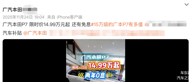 广汽本田的电车P7最高优惠达到5万元,部分经销商也在社交媒体上进行了宣传。