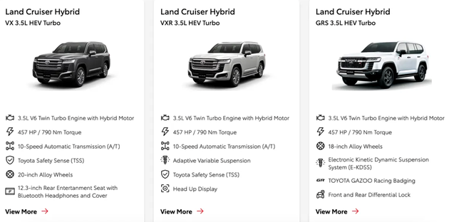 新款 丰田兰德酷路泽300 Hybrid是电混车型,共推出VX、ZX、GR SPORT三个版本。