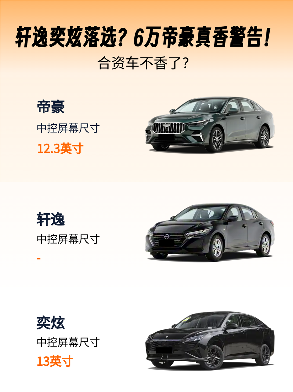 🚀 智能碾压:帝豪12.3英寸大屏+语音控制空调导航,轩逸低配还是8寸"老年机",奕炫13寸屏竟不能连WiFi!
