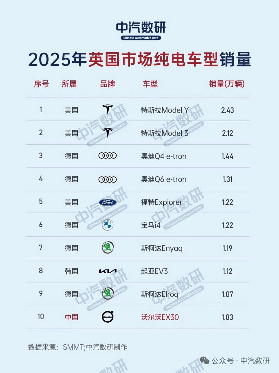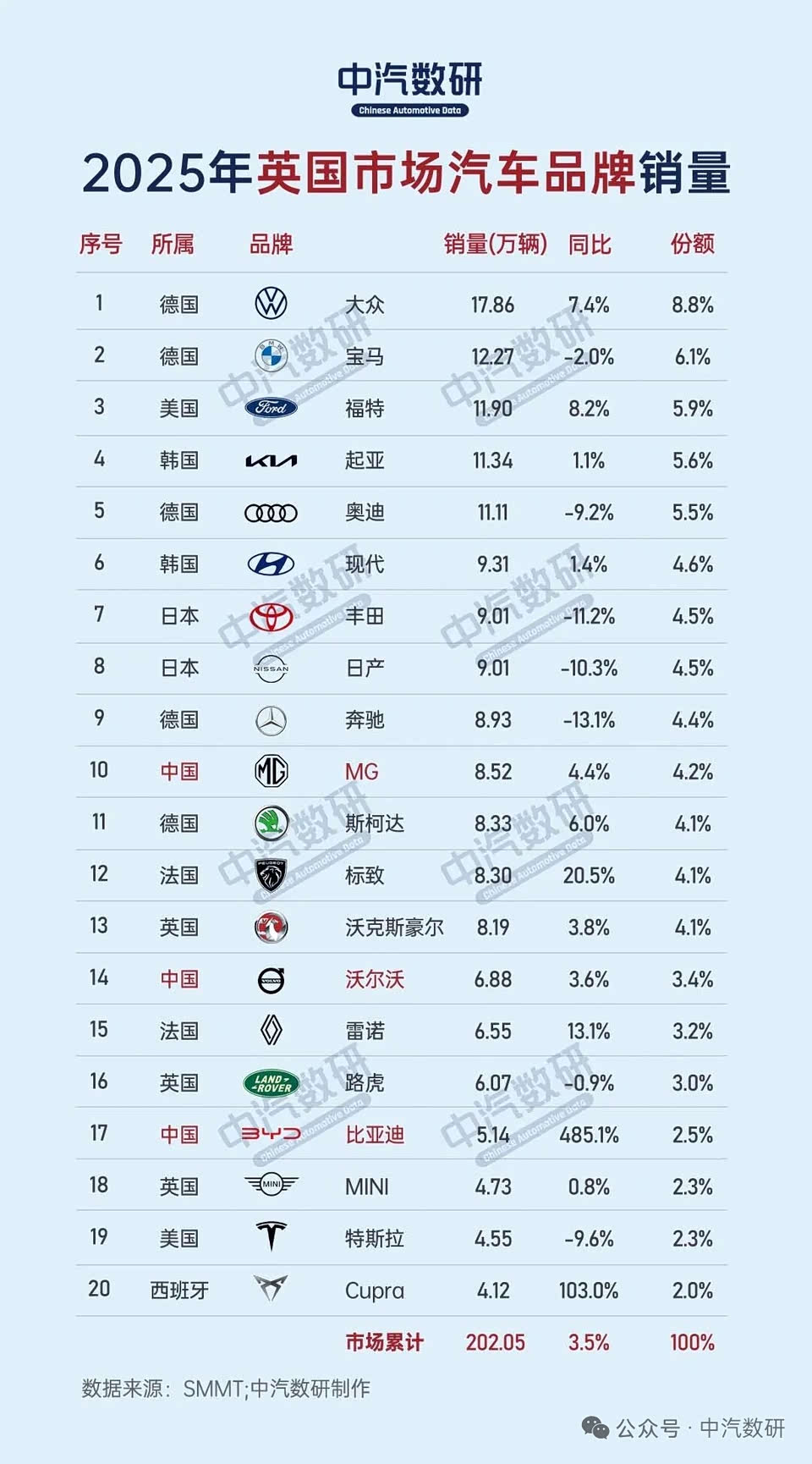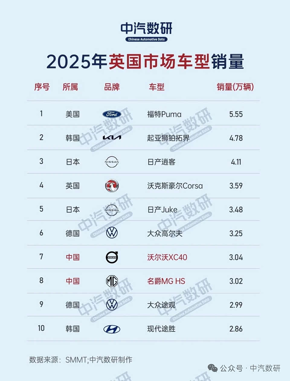 2025年英国汽车销量排行榜已经出炉,咱们盘点一下: 品牌榜前10,中国MG排在第10位,卖了8.8万辆,份额4.2%,差不多是德国大众定位一半。德国的大众、宝马、奥迪、奔驰,都进入了前十。日系丰田、日产上榜。 车型销量,进榜的中国车型有沃尔沃XC40,名爵MG HS。 纯电车型销量榜,进榜的是沃尔沃EX30。 车型层面咋评价呢,比亚迪2025年在英国卖了5.1万辆,同比大幅增长,算是让英国人感受到了中国汽车工业的风采。