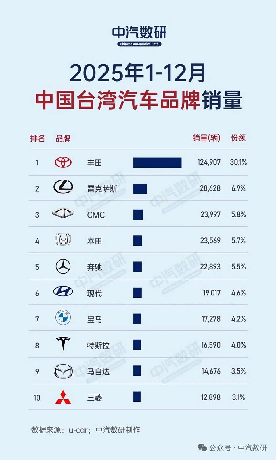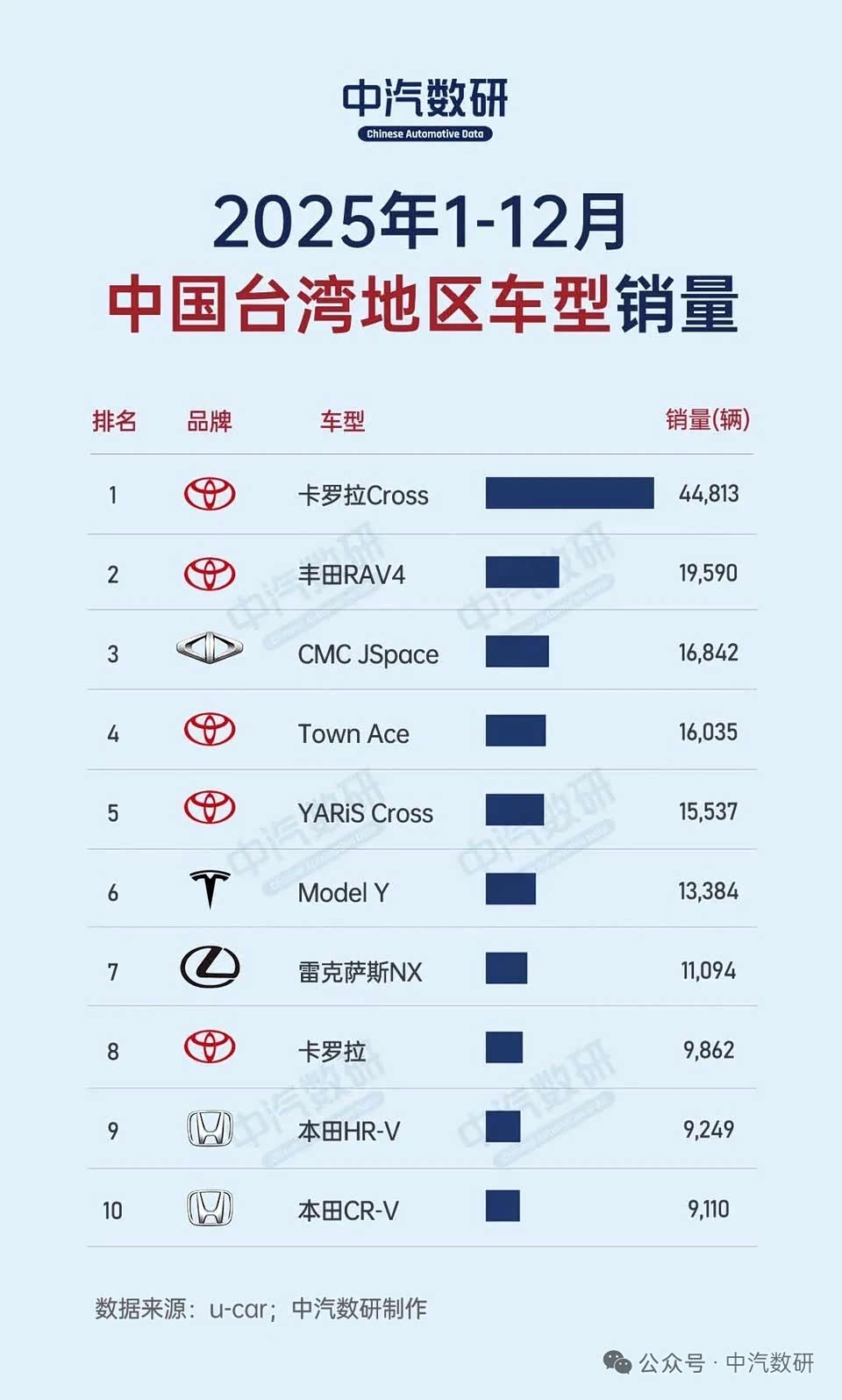 2025年中国台湾销量排行榜 从2025年中国台湾销量排行榜来看,日系车占据了大半“江山”,丰田断崖式领先,旗下的卡罗拉,RAV4,雅力士,town ace都进入车型销量排行榜的前列。雷克萨斯排在第二位,还是归属于丰田,再后面是本田。 上汽名爵MG进入台湾市场后,销量也曾经大发“异彩”,不过在2024年受政策限制(本地生产零部件比例),销售势头戛然而止。 前段时间,在中国台湾热销的售价15万的飞度,估计大家都看到了