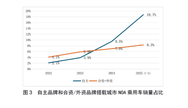 《报告》显示,2025年1-11月,我国搭载城市NOA功能的乘用车累计销量达312.9万辆,渗透率占乘用车上险量的15.1%,较2024年全年提升5.6个百分点。其中,自主品牌销量中搭载城市NOA功能的车型销量占比达到18.7%,而合资品牌搭载NOA功能的乘用车销量占比仅为8.3%。