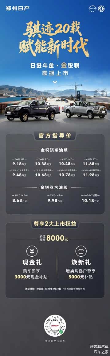 在“骐迹20载・赋能新时代”主题庆典上,郑州日产推出全新金锐骐皮卡,起售价8.68万元。该车凝聚二十年技术与品质沉淀,旨在成为产业奋斗路上的高效生产力工具。现推出8000元限时购车优惠,前200名用户更可获赠“锐骐皮卡20周年·定制金钞”。