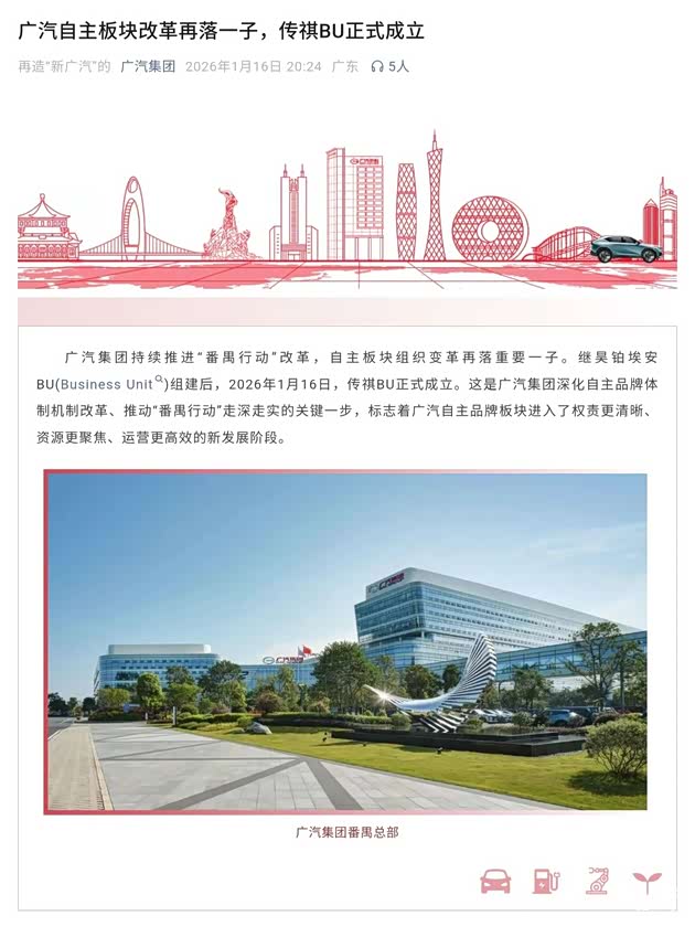 1月16日,广汽集团宣布正式成立传祺BU,这是继昊铂埃安BU后,其自主品牌组织变革的又一关键举措,标志着“番禺行动”改革进入深水区,自主板块迈入权责清晰、资源聚焦、运营高效的新阶段。