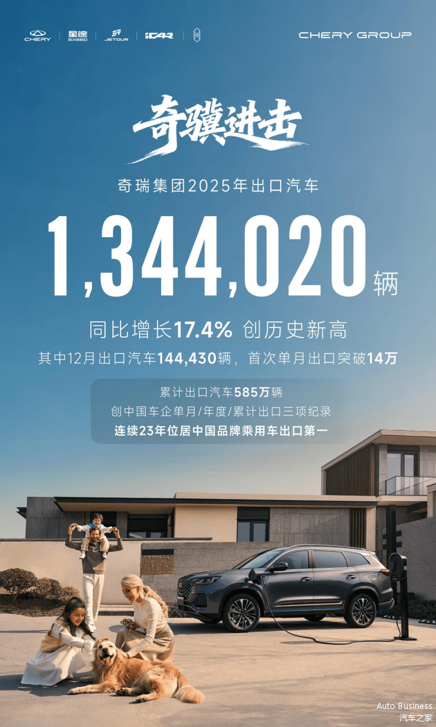 过去的一年,奇瑞的全球化能力也得到了进一步的放大。数据显示,其12月单月出口达到14.4万辆,同比增长46.8%,首次突破14万辆的单月出口大关;全年出口达到134.4万辆,同比增长17.4%;累计出口585万辆,这三项数据均刷新了中国车企的出口纪录。截至目前,其业务已覆盖全球120多个国家和地区,全球用户累计达到1853万。这不仅展示了奇瑞在全球市场的深厚积淀,更意味着它的领先地位已经超越了单纯的“窗口期红利”,而是通过持续的战略布局和品牌价值积累,打造了难以轻易复制的全球化护城河。