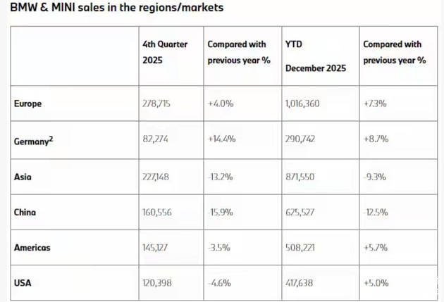不过,区域表现呈现明显分化。欧洲市场成为宝马全球增长的主要引擎,全年销量达到1,016,360辆,同比大幅增长7.3%。在其大本营德国,宝马更是实现了8.9%的同比增长。