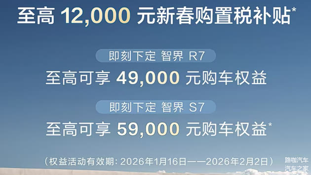 智界给出的政策是,1月16日到2月2日之间,限时可享受最高1.2万元的新春购置税补贴。同时,下定智界R7有最高4.9万元的购车权益,下定智界S7有最高5.9万元的购车权益。