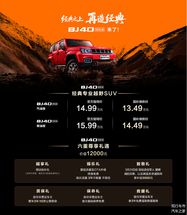 BJ40这个品牌作为国内越野车老炮级别的品牌,一直都以专业但是又低调的身份存在着,给无数的越野人提供了可靠的越野车辆。但是有着如此深厚的历史,BJ系列确从来不靠炒作情怀来提高售价。在方盒子越野车如此受欢迎的当下,BJ40全新车型依然坚持了高配且实惠的策略,并且有着极大的后期改装空间。不论是对于专业的越野玩家,还是喜欢越野风格的普通消费者,BJ40都是一款优秀的产品。