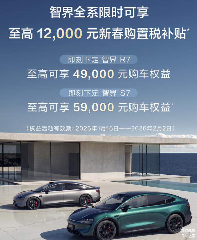 当农历新年的脚步渐近,车市也迎来传统的购车旺季。1月16日,智界汽车重磅推出新春购车福利,以一份“真金白银”的厚礼叩响市场大门:智界R7与S7两款主力车型,分别提供了至高49,000元和59,000元的购车权益,将高阶智能出行体验的入手门槛大幅拉低。