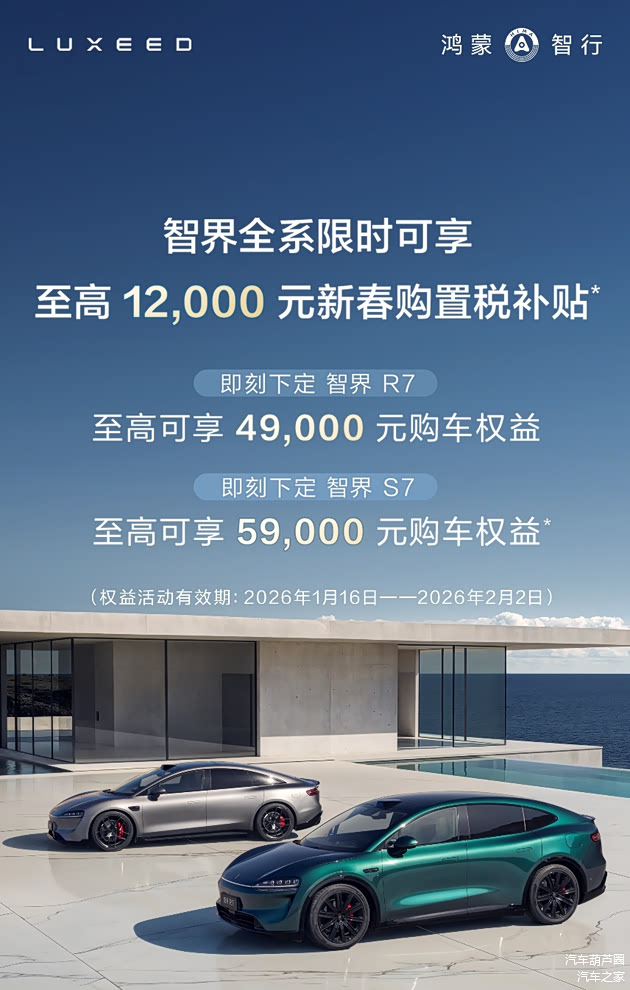 随着新春消费旺季来临,鸿蒙智行旗下高端新能源汽车品牌智界今日宣布,于1月16日至2月2日期间启动“新春购车季”限时优惠活动。活动覆盖智界全系车型,用户可享至高12,000元新春购置税补贴,S7、R7还分别有5.9万、4.9万专属权益,想要“抄底”的小伙伴们,此刻不冲更待何时?