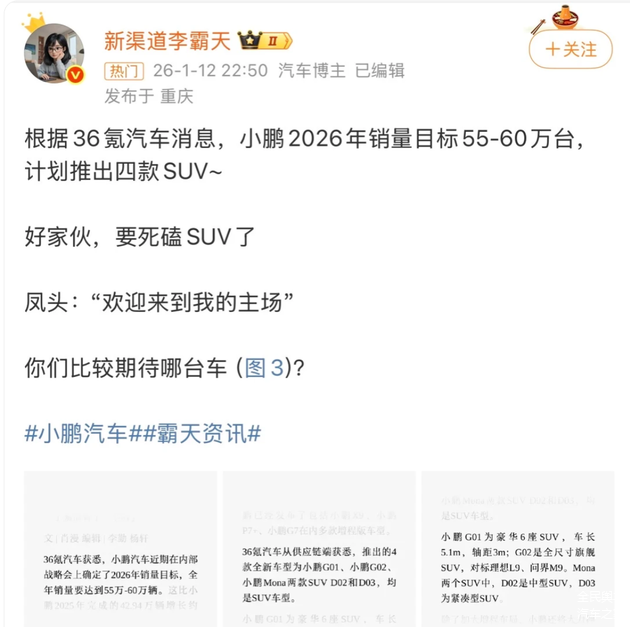 2026 年的 SUV 市场,注定因小鹏的强势入局而更加精彩。4 款全新 SUV 能否凭借精准定位与产品实力打动消费者,55 万 - 60 万辆的销量目标能否顺利达成?让我们拭目以待。你最期待小鹏这 4 款 SUV 中的哪一款?欢迎在评论区分享你的看法!
