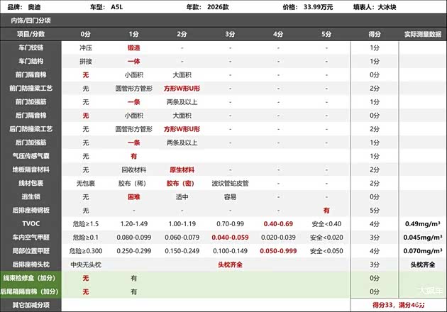 2026款奥迪A5L内饰评分