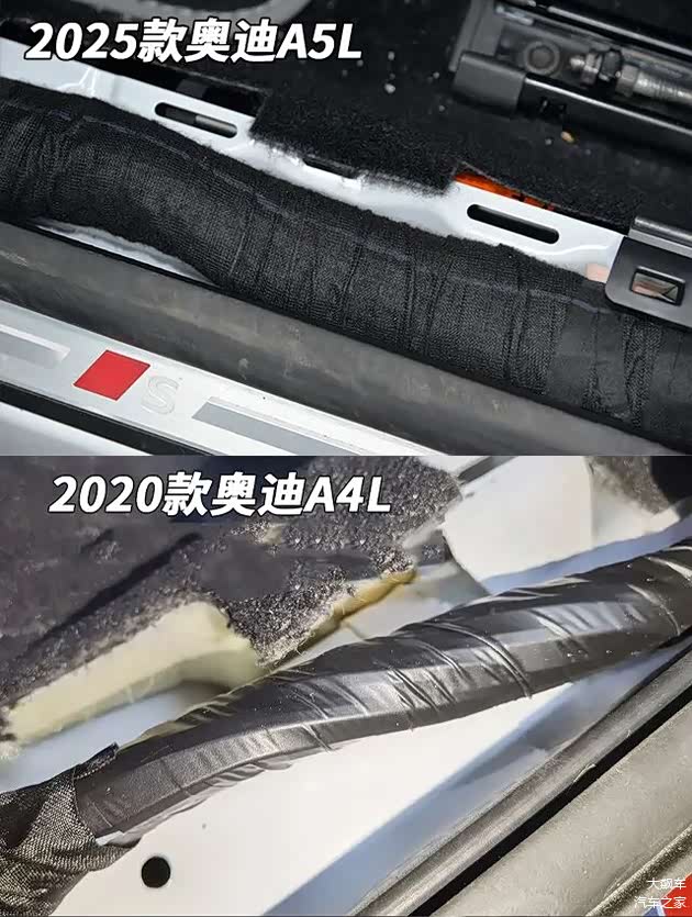 这辆车的地板大线包裹不仅严密,而且使用的是比较好的布基胶布,比老款A4L的塑料胶布好很多。