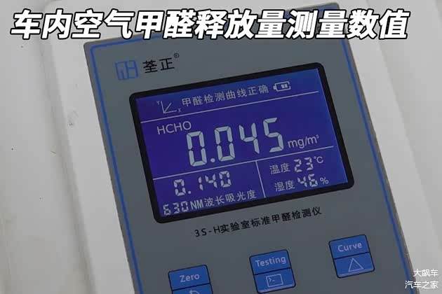 经过在23±1℃恒温环境中16小时的封闭,这辆车的车内空气甲醛释放量测量数值为0.045毫克每立方米。