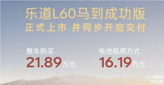 日前,Auto情报处从乐道官方处获悉,2026款 乐道L60马到成功版正式上市,乐道L60基于900V架构打造而来,马到成功版共推出1款配置车型,指导价为21.89万元,租电池方式16.19万元,马到成功版CLTC纯电续航里程为530公里。
