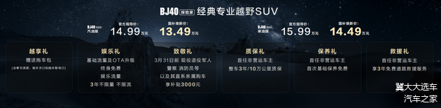 - 购车权益:北京越野公布了六项购车礼遇,包括赠送拖车包、终身免费基础流量、特定职业人群购车补贴、整车质保、免费首保及道路救援服务。