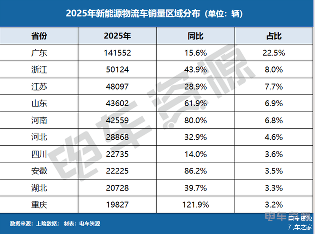 值得注意的是,多个省份在2025年实现了爆发式增长。重庆以121.9%的同比增速领跑全国,销量达19287辆,展现出作为西南地区重要物流枢纽的强大活力。安徽省也实现了86.2%的高速增长,区域市场格局正在快速演变。