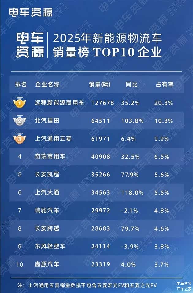 从全年累计销量来看,远程新能源商用车以127678辆的销量位居榜首,市场占有率达到20.3%,展现出明显的领先优势。北汽福田则以64511辆位列第二,同比增幅高达103.8%,增速在前十中排名第二,表现尤为抢眼。上汽通用五菱以61971辆的市场销量排名第三,市占率接近10%。