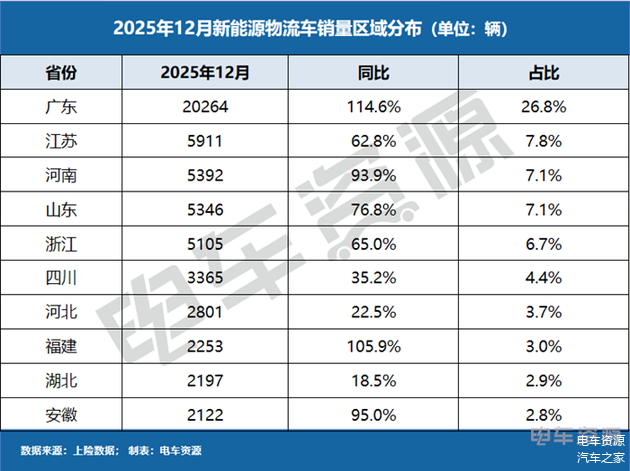 这一效应在广东省等核心地区表现得最为突出,2025年12月广东销量同比增长114.6%,达20264辆,遥遥领先。原因在于:一方面广东作为最大的市场,拥有最庞大的潜在用户群体和最为活跃的物流企业,对成本政策的变动反应最为迅速;另一方面,主机厂和经销商为冲击年度目标,往往会在年底向广东这样的核心市场倾斜资源和促销力度,与政策利好形成合力,进一步放大销量峰值。