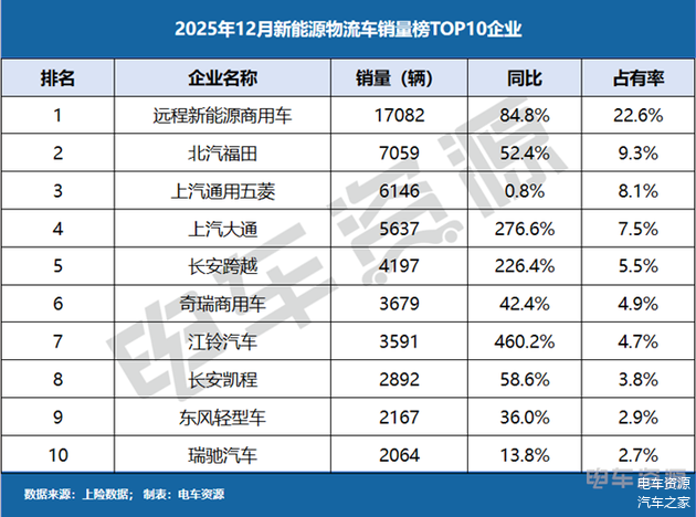 从2025年12月单月销量榜来看,企业在年末冲刺阶段表现活跃。远程新能源商用车单月销量17082辆,以22.6%的月度占有率稳居第一。值得注意的是,江铃汽车以460.2%的增速展现出强大的爆发力;上汽大通、长安跨越单月同比增长均超过200%,表现同样突出。