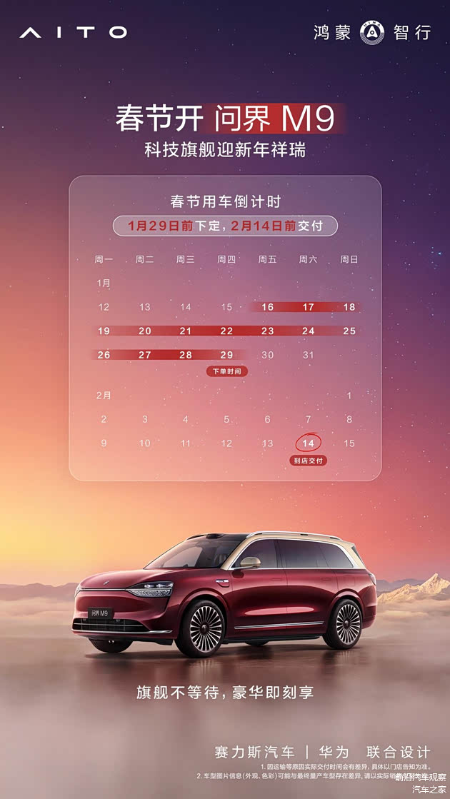 眼下正值福利窗口期,无疑是入手这款“全景智慧旗舰SUV”的最佳时机!即日起至2月2日下定,即可享受至高87000元的购车权益,具体权益详情请查询官网、问界汽车APP或到店咨询。心动不如行动,这个春节,让问界M9伴您开启一段更智慧、更豪华的崭新旅程。