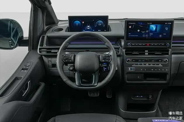 外观方面,Staria Electric 维持了极具未来感的一体曲线轮廓。为了强化电耗,车头采用封闭式几何表面格栅,搭配贯穿式水平日行灯,营造出洁净且高科技的视觉印象。低窗线的设计不仅强化了车侧的层次感,更为车内乘客提供了广阔的视觉视野。此外,17寸空力优化铝圈也是纯电版专属配置,平衡了节能与负载支撑。