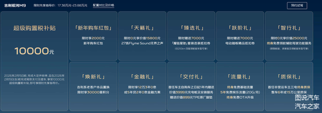 吉利银河M9现阶段也享受购置税补贴政策,截止到2月15日前,完成大定并锁单的用户,并支付尾款和提车,都可以享受1万的购置税补贴。