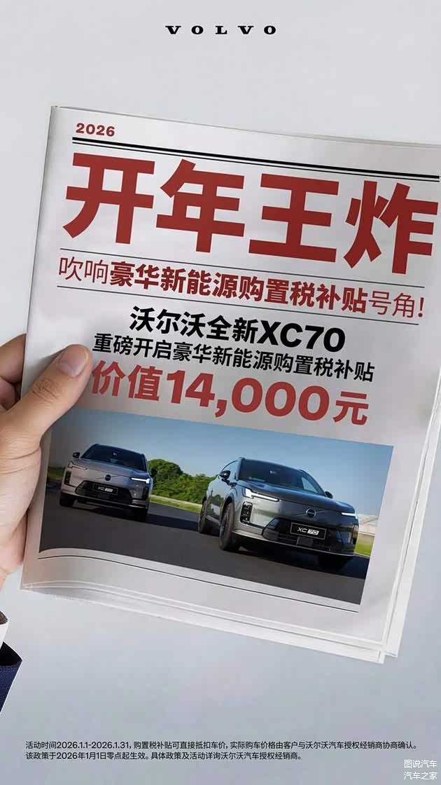 全新XC70享受限时促销政策,包括高达1.4万的购置税补贴,以及三电终身质保+NPA领航辅助功能免费使用权。
