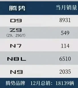 1:腾势D9卖了8931辆,依旧是MPV赛道最受欢迎的一款车。 2:腾势N8L卖了6510辆,这是比亚迪10月刚推出的一款大型SUV。 3:腾势N9卖了2035辆,虽然动力比腾势N8L强,但价格贵了10万劝退不少人。 4:腾势Z9卖了549辆,技术确实很不错,不知道为什么就是销量起不来。 5:腾势N7卖了114辆 虽然12月份腾势品牌销量18139辆创新高,但是跟极氪 问界等品牌比还是差太多了。希望2026年继续努力吧。