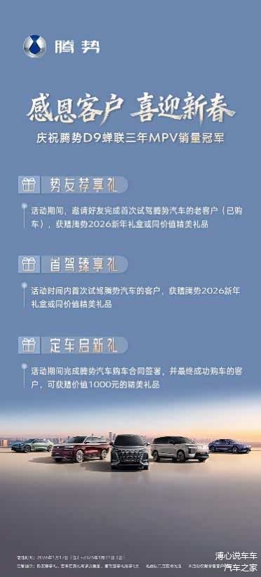 喜迎新春,好势连连。腾势D9连续三年蝉联MPV销量冠军,腾势汽车2025年销量达到157134辆,同比增长24.7%。为回馈广大用户长期的支持与厚爱,腾势汽车于2026年1月17日-1月31日期间特别开启“感恩客户 喜迎新春”主题活动,面向腾势全系车型推出三重诚挚礼遇,与新老“势友”共庆辉煌,携手开启新年旅程。