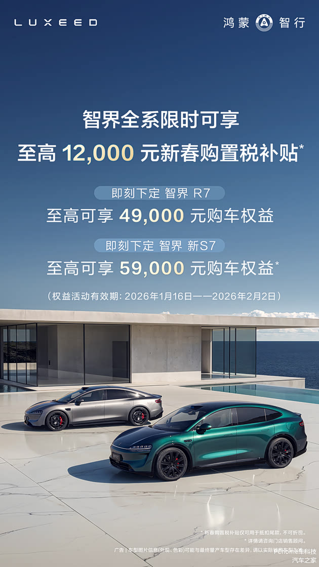 2026年1月17日,智界汽车官方微博昨日发布消息,即日起至2月2日,智界全系限时可享至高12000元购置税补贴。