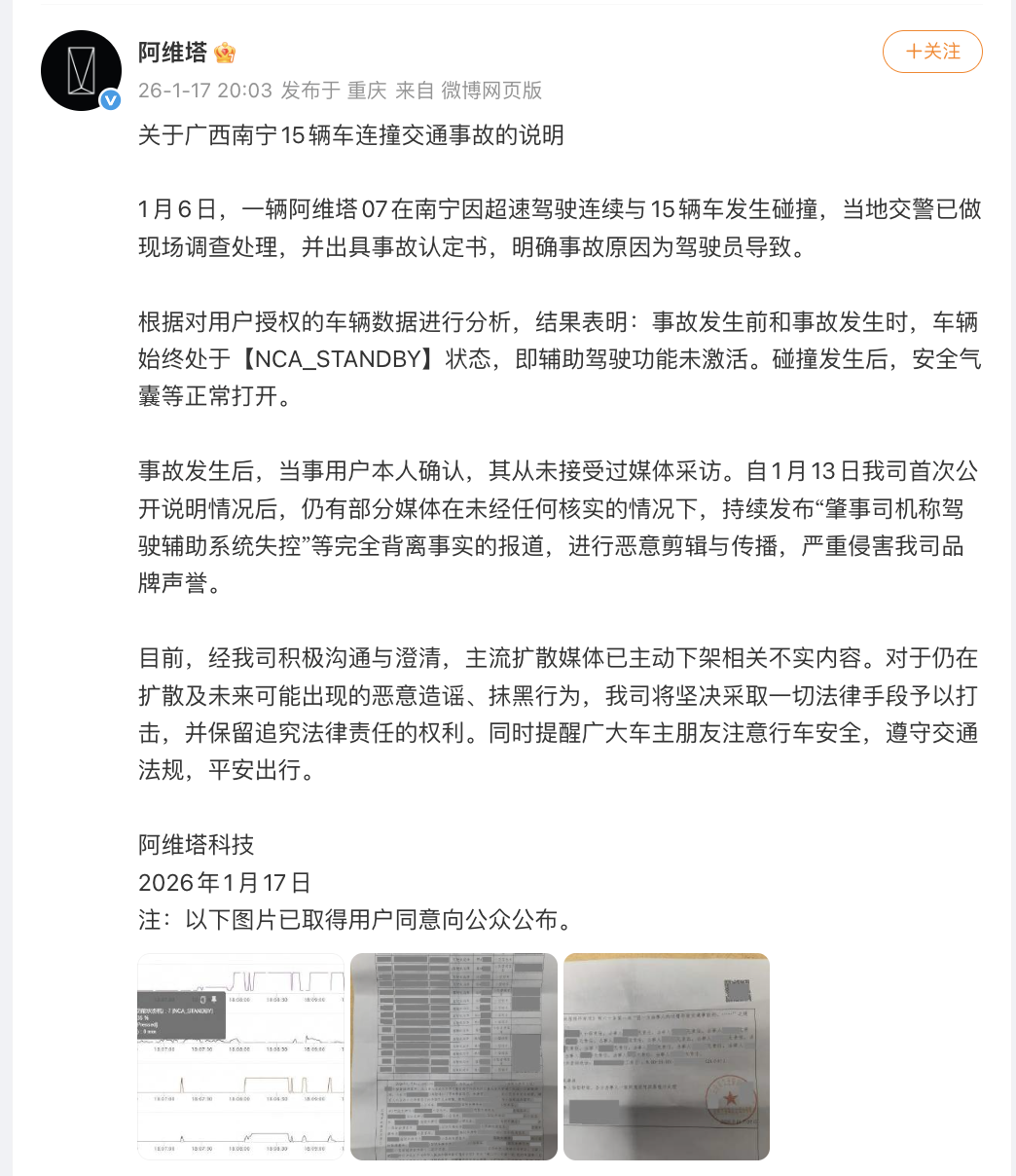 阿维塔回应“广西南宁连撞15车”:辅助驾驶功能未激活