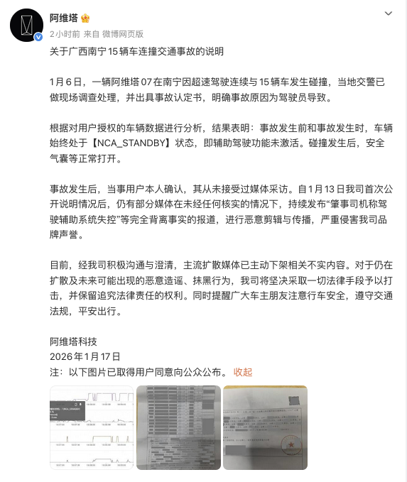首先是阿维塔方面,1月17日,阿维塔官方发布正式说明: