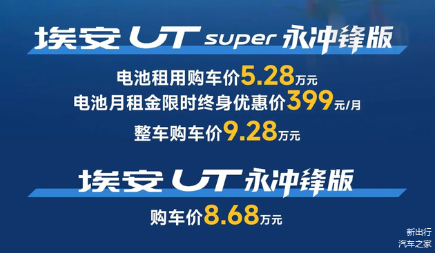日前,埃安 UT 系列永冲锋版正式上市。埃安 UT 永冲锋版购车价 8.68 万元,UT super 永冲锋版整车购买价 9.28 万元,电池租用购车价 5.28 万元,电池月租金限时终身优惠价 399 元/月。