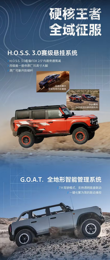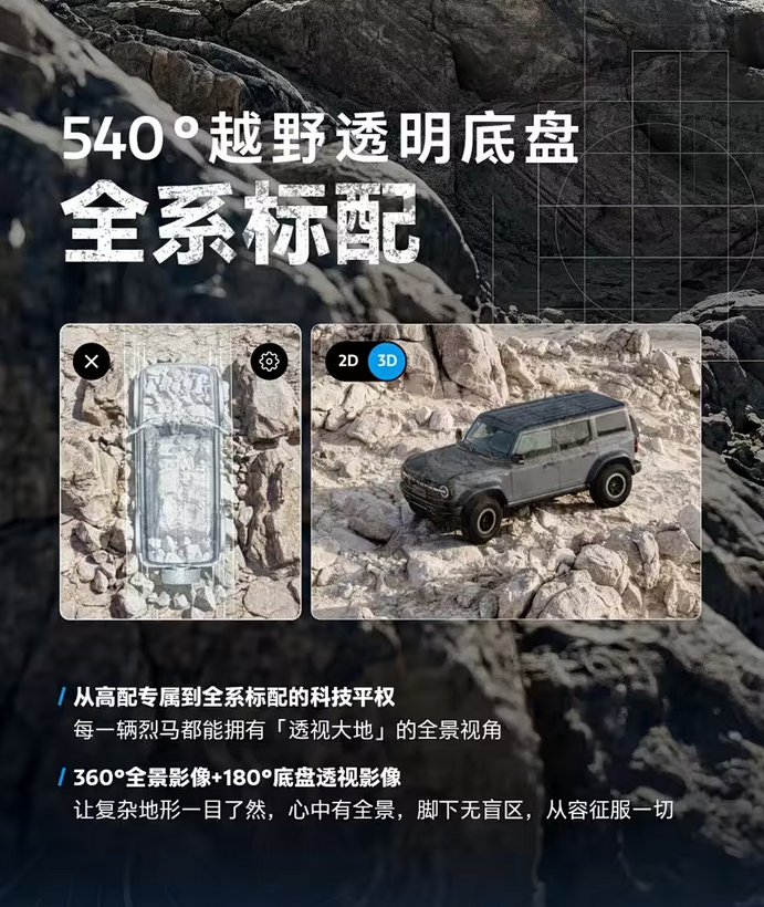 越野配置上,新车全系标配540°越野透明底盘,提供H.O.S.S. 3.0赛级悬架系统,配备FOX 2.5''内路旁通氮减,提供原厂35英寸大脚车轮和原厂可断开防倾杆。同时,新款烈马还支持G.O.A.T.全地形智能管理系统,提供7大驾驶模式,支持透明底盘联动。