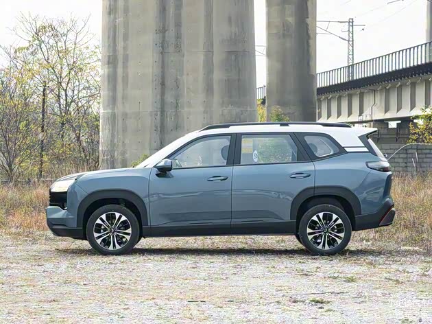 再来看车身侧面部分,4745×1850×1755mm的车身尺寸配合2810mm超长轴距,创造出同级罕见的83%空间得房率。方正硬朗的车身轮廓通过悬浮式车顶、18英寸花瓣轮毂、车顶行李架等元素强化越野气质,215/55 R18的轮胎规格兼顾城市道路与轻度越野需求。车身侧面采用双腰线设计,上腰线贯穿前后门把手,下腰线配合黑色轮眉形成力量感十足的视觉效果。D柱位置的镀铬饰条与双色车身设计,为硬派造型注入时尚元素。