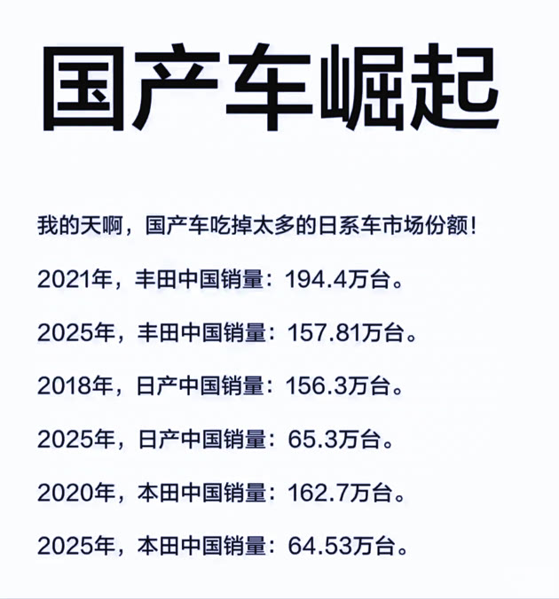 2,丰田在我国市场年销量从巅峰的194.4万台下滑到2025年的157.81万台。